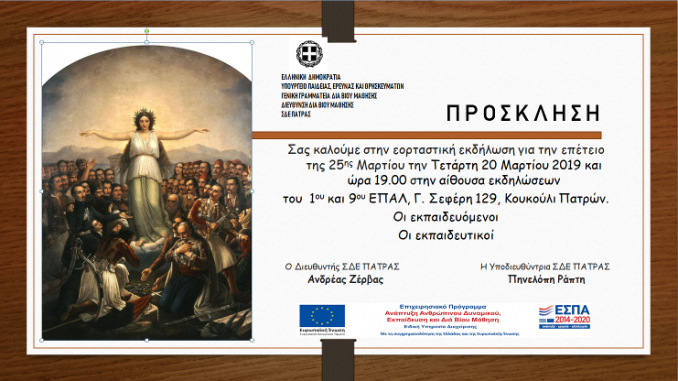 ΠΡΟΣΚΛΗΣΗ ΓΙΑ ΕΚΔΗΛΩΣΗ 25Ης ΜΑΡΤΙΟΥ 15 Μαρτίου 2019 sdepatr 2018-2019 0 Οι εκπαιδευόμενοι, οι εκπαιδευτικοί και η διεύθυνση του Σ.Δ.Ε Πάτρας σας προσκαλούν στην εκδήλωση-αφιέρωμα για την 25η Μαρτίου 1821 στο χώρο εκδηλώσεων του 1ου και 9ου ΕΠΑΛ Πατρών.